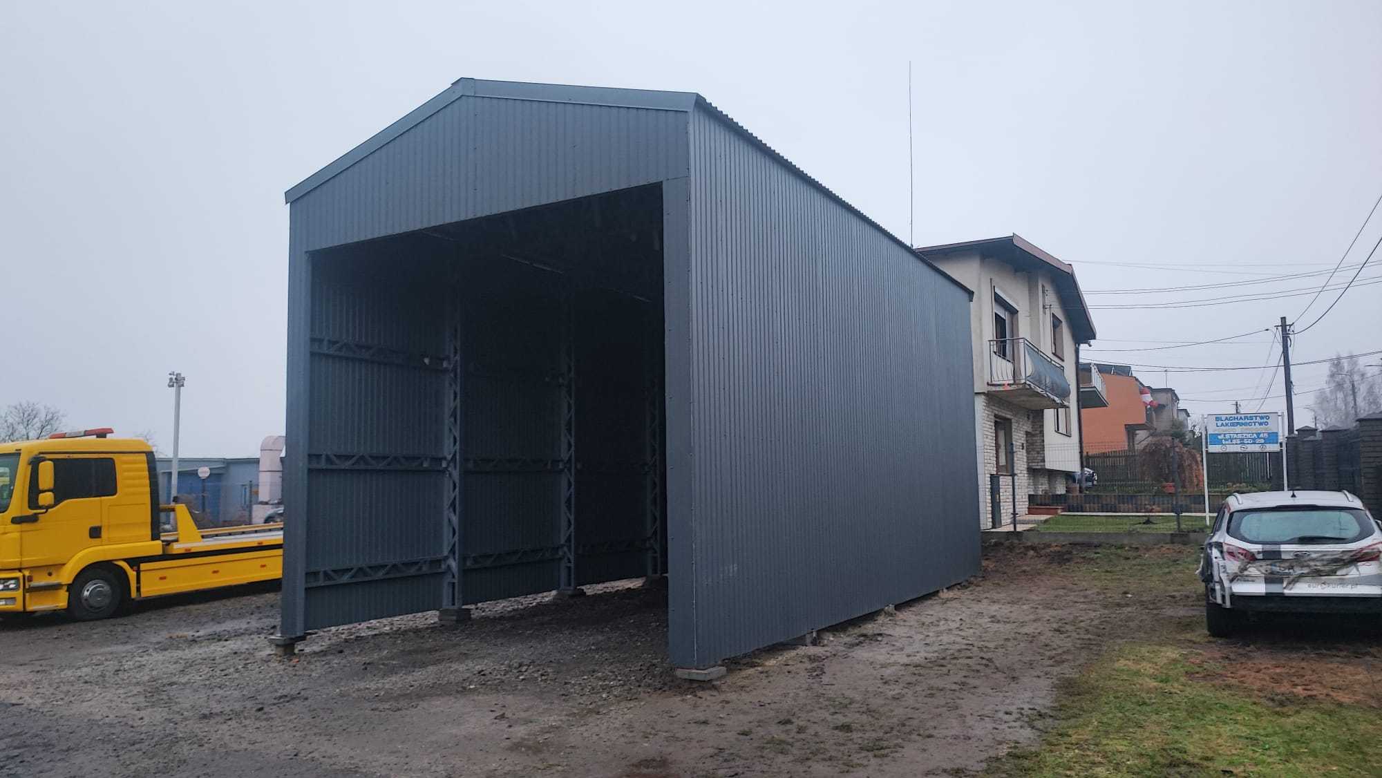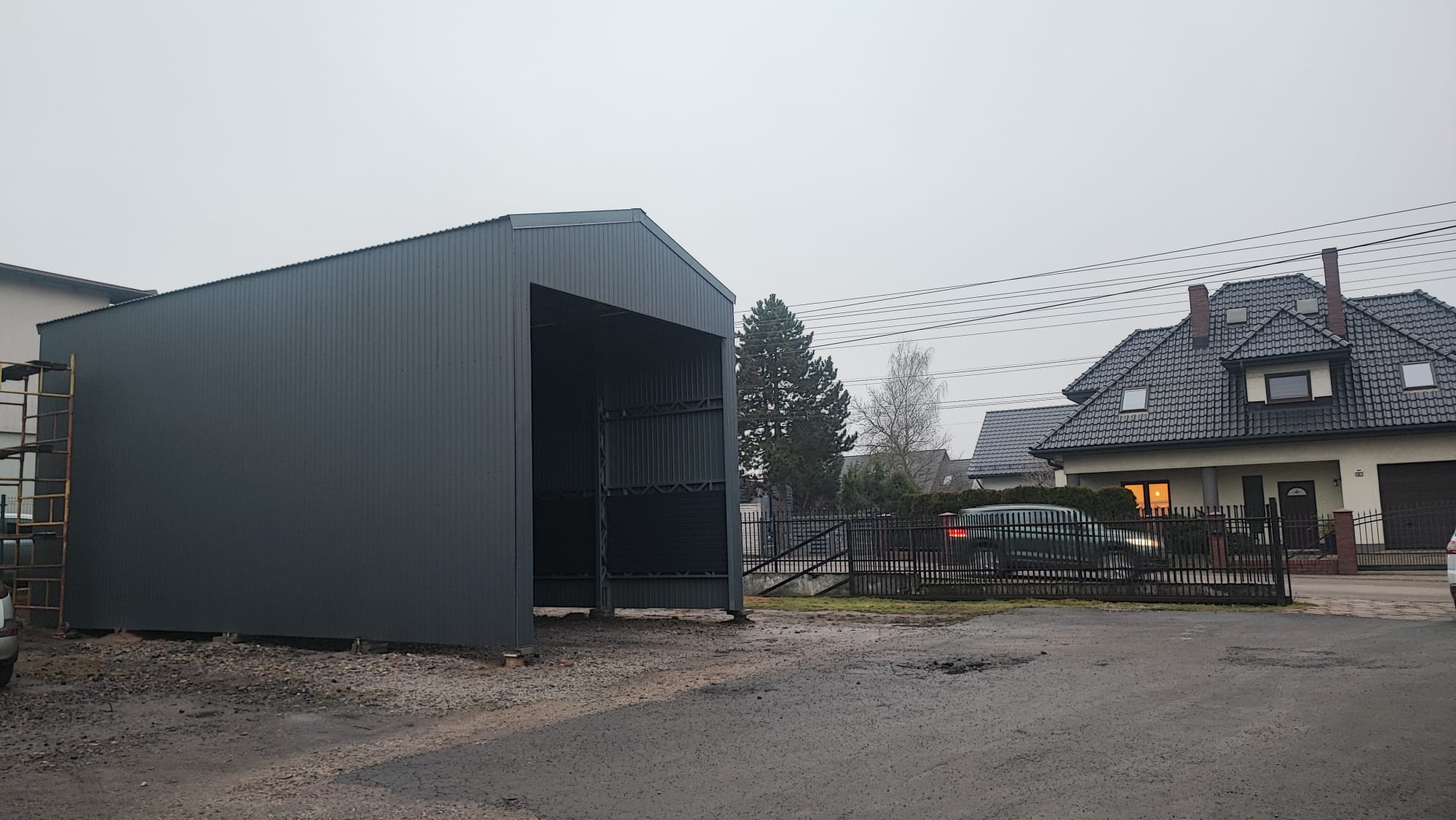 Zrealizowany na terenie gminy Tarnowskie Góry “Projekt nr 59” to doskonały przykład wszechstronności technologii stalowej. Jest to obiekt typu wiata/garaż o imponujących wymiarach (5×10 m) i wysokości aż 5,5 metra. Takie parametry czynią go idealnym miejscem do parkowania dużych pojazdów – kamperów, maszyn rolniczych czy samochodów dostawczych – lub wykorzystania jako przestronny magazyn. Nowoczesna, grafitowa bryła (RAL 7016) prezentuje się estetycznie i profesjonalnie, a fakt, że wykonawcą był sam inwestor, dowodzi przystępności systemu montażowego.