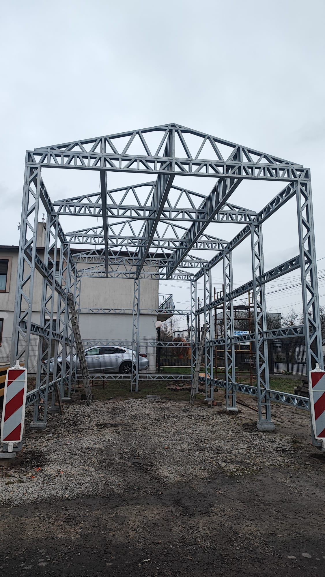 Fundament i Montaż: Konstrukcja została posadowiona na lanych stopach fundamentowych, co zapewnia stabilne przenoszenie obciążeń na grunt. System LGS umożliwił sprawny montaż bezpośrednio przez inwestora.